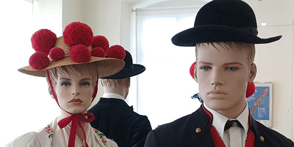 Die großen, roten Bollen auf dem Trachtenhut der Schwarzwälder Frauen sind in der Ausstellung am Beispiel der Renchtäler Tracht und der Gutachtäler Rollenhut-Tracht zu sehen. Neben den in Trachtenmontur steckenden Schaufensterpuppen geben Schautafeln Auskunft über Details der Kleidung und ihre Historie.