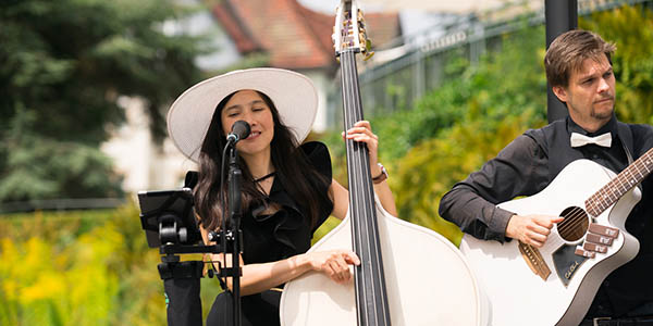 Mit ihrem charakteristischen weißen Kontrabass, sommerlich weißem Kleid und Sommerhut steht sie auf den Bühnen und Plätzen, versprüht Leichtigkeit und gute Laune: Mimi Grimm am großen Zupfinstrument, gemeinsam mit ihrem Lebens- und Bühnenpartner Steffen Zäuner an der Gitarre, bringt Sonne in die Herzen. In Weinheim sind sie gute Bekannte und treffen stets auf eine große Fanschar. Am Samstag, 2. August, treten sie bei der Musikreihe „Woinem live am Windeckplatz auf – dort inmitten der City haben sie schon einige Male Sommergefühle erzeugt. Diesmal passt es besonders gut, weil am Wochenende (vor der Kerwe) nach einigen Regentagen wieder der Sommer zurückkehren soll. Mimi hat ihn meistens im Gepäck, ebenso wie gute Laune versprühende Songs, die zu einem warmen Sommertag passen.